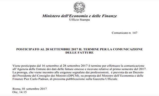 Vi informiamo che relativamente alla comunicazione spesometro, è stata ufficializzata la proroga per la presentazione della comunicazione dal 18 al 28 settembre 2017.